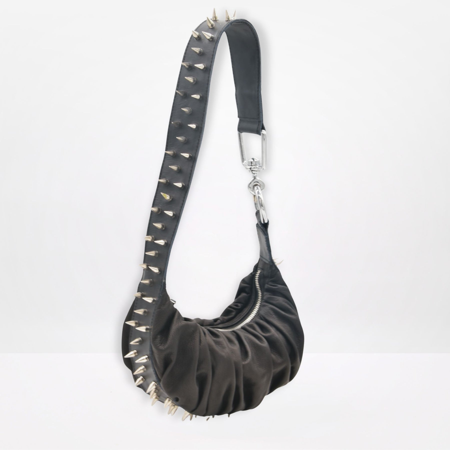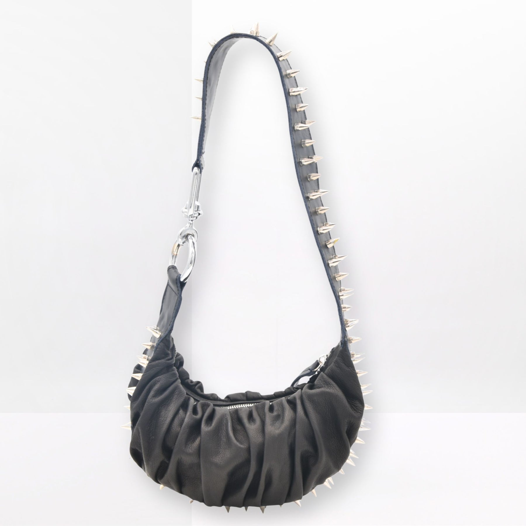 Hand pleated from buttery soft sheep leather and framed with glinting studs, Blakely is a half-moon shoulder bag that curves close to the body with unapologetic attitude. Sensual, sculptural, and a little wild this is the bag that turns heads from daylight restraint to midnight rebellion.
