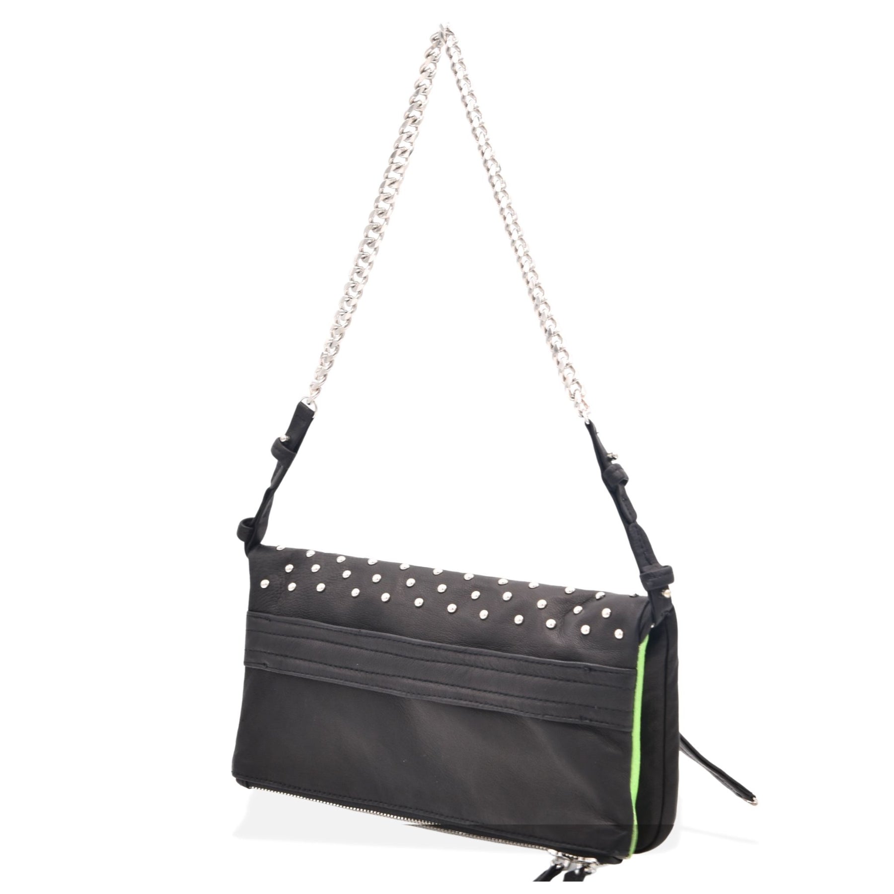 Hatsy a new model in my collection , she is made from the softer leather , a beautiful clutch adorned with studs and a detailed band over the cover to slide your hand around the clutch for an easy grip , afcouse she also has an detachable shoulder chain . , but there are more surprises other then the several compartments ether is a gorges piping green when you open the  clutch ..again a bag full of details and surprises