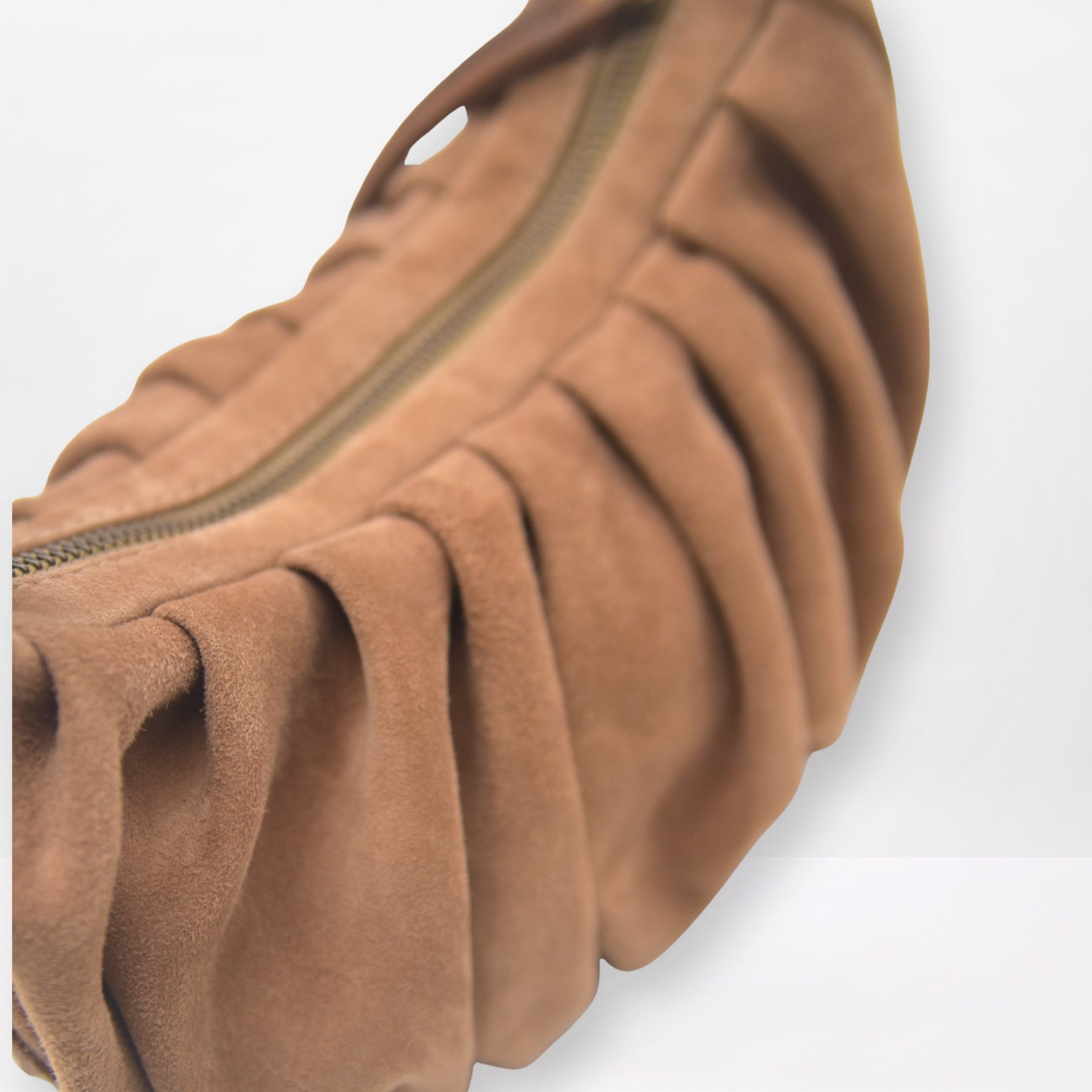 Haven is one of those designs that arrived as a feeling before it became a shape. I wanted a bag that felt organic something that curves into the body and moves with you. The soft tan suede brings warmth, while the handle wraps itself around the silhouette almost like a living gesture.