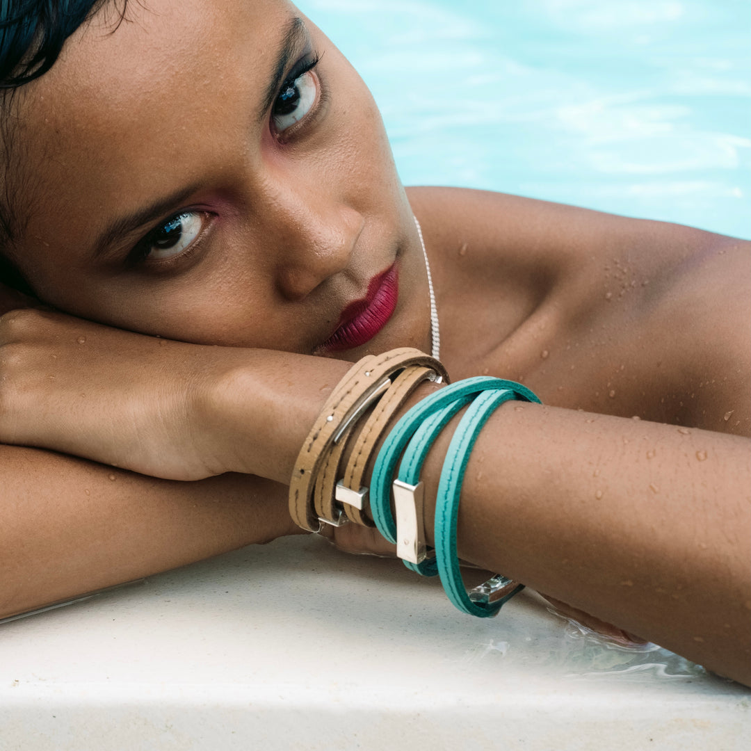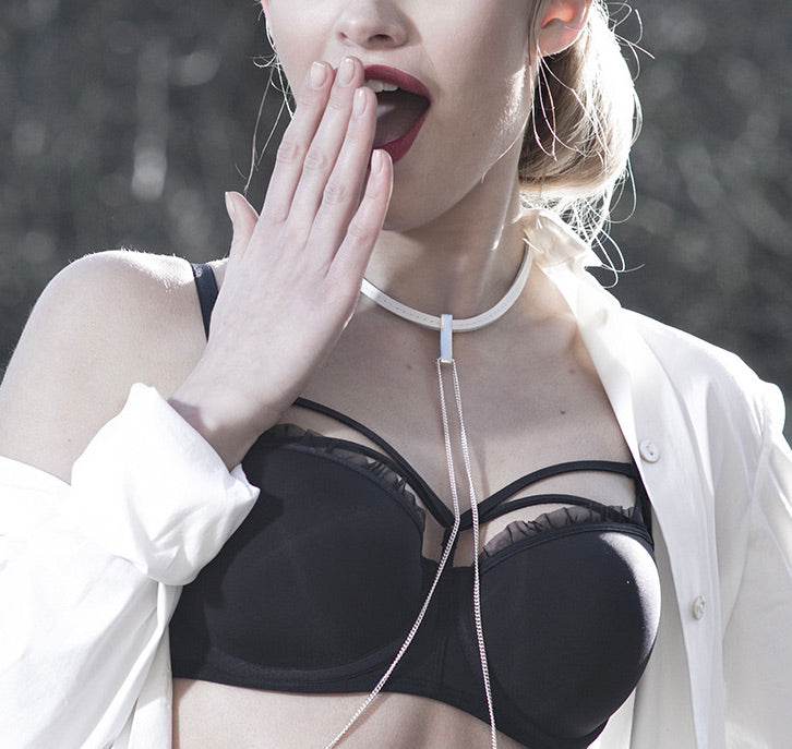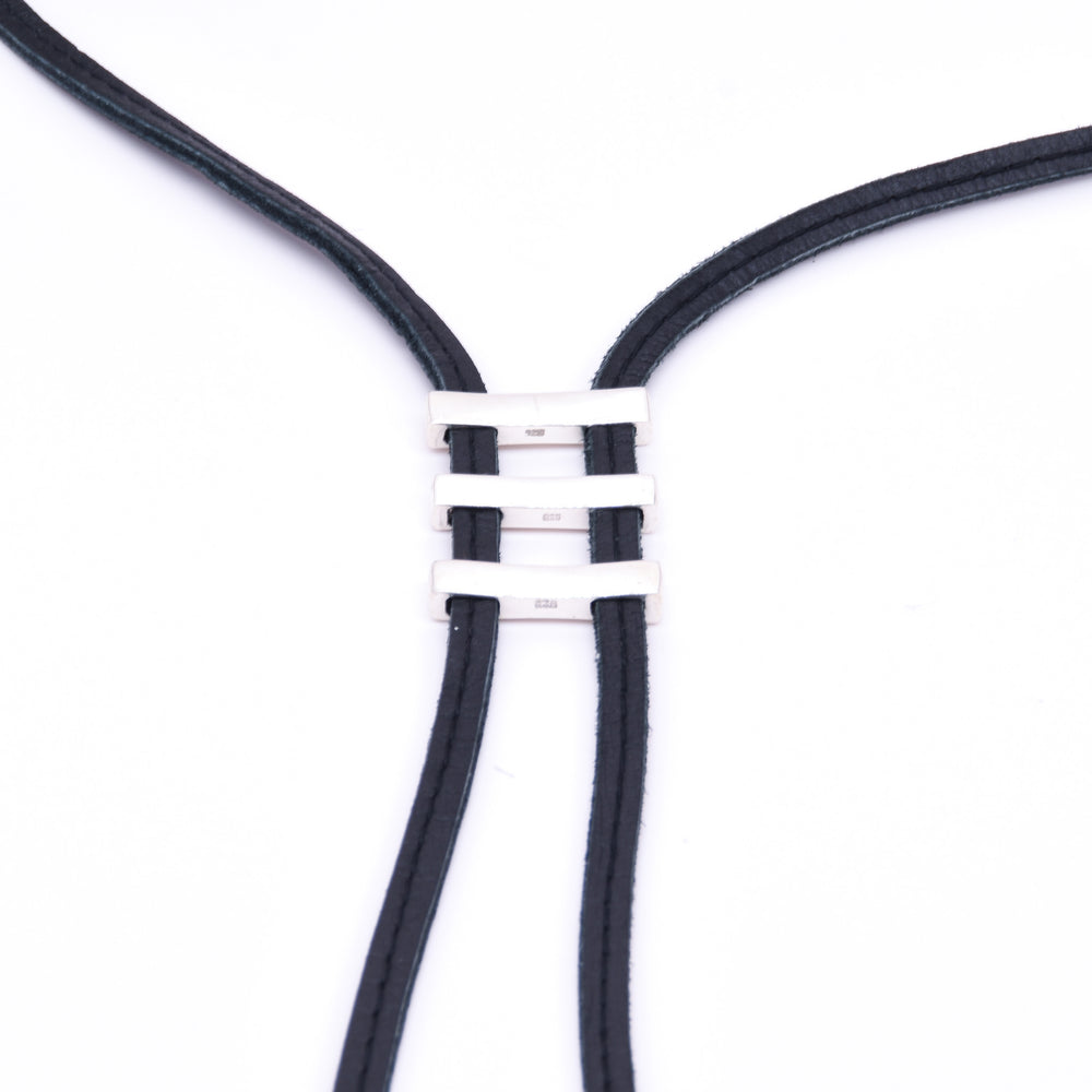 Inspired by modern minimalism and crafted in small batches, our pieces combine the purity of sterling silver with the natural beauty of leather. The result is a collection that is sensual, sculptural, and effortlessly wearable — from day to night.